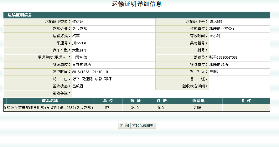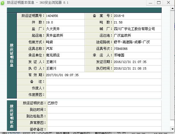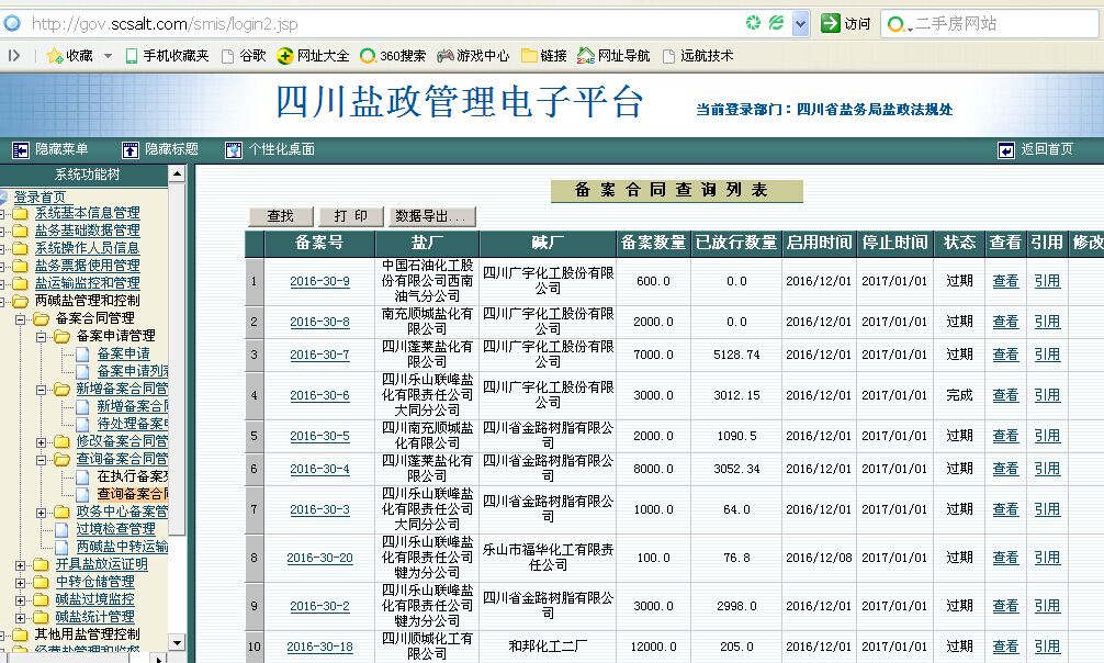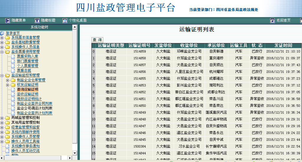 截圖紀念。元旦零時,四川省鹽務管理局耗資數百萬的《四川鹽政電子管理平台》全部停止運行,備份數據副本後關閉,也結束它的曆史使命。《四川鹽政電子管理平台》對所有制鹽企業出廠鹽産品、所有省鹽業總公司調入鹽産品實行監管,每一筆鹽産品的省内和出省的放運,分别食鹽和其他鹽産品開具準運證或放運證明,實行出廠登錄,到點簽收。電子管理平台停止運行後,要求所有在川從事食鹽批發、工業鹽銷售的企業自律,售後按市(州)分縣(市、區)統計《鹽業企業鹽産品自銷表》,提供給市(州)、省鹽業市場監管機構,作為保障食鹽供應安全和防止工業鹽流入食鹽市場的事後監督檢查銷售記錄必要措施。