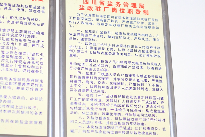 根據《四川省鹽業管理條例》第27條的規定,省鹽務局與各制鹽企業、兩堿用鹽企業溝通後,于2001年8月3日開始組織鹽政執法人員進駐全省所有制鹽企業門口、兩堿用鹽企業廠前,配套開發了鹽産品監控電子平台,實行按計劃辦理食鹽準運證、按備案合同辦理鹽産品放運證明後出廠制度,實行鹽産品放運到達的點對點全程檢查,使全省查獲流入食鹽市場包括非碘鹽、不合格鹽從上萬多噸級的私鹽規模,随着堵源截流的深入減少至百噸數低位違法鹽産品其中不少還是竄銷鹽,有效和公正地規範了全省食鹽和其他用鹽的運輸、購銷活動,有效和便利地規制了全省的食鹽專營和工業鹽購銷的法定秩序,為全省依照《四川省鹽業管理條例》的良法治鹽、為全省實現食鹽加碘消除碘缺乏病的消除達标,促進産銷企業按照鹽業法規從事鹽的生産和經營,保障全省人民群衆的加碘食用鹽供應和質量安全,發揮了卓有成效的龍頭管控作用,具有鮮明的四川依法治鹽特色。