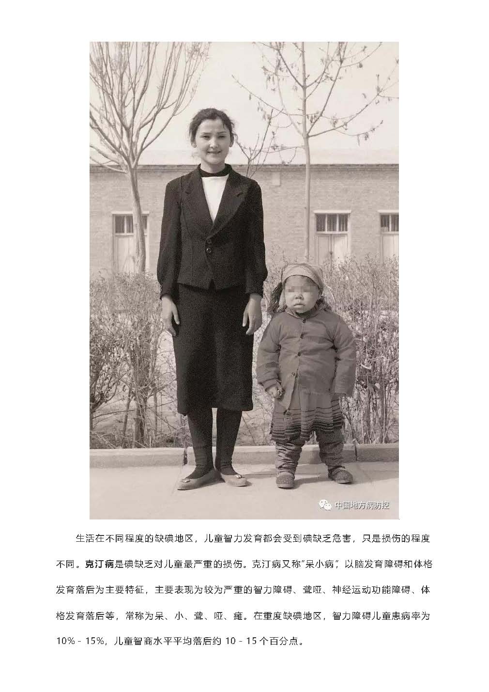 7.碘缺乏病是由于外環境缺碘,造成人體碘攝入不足而發生的一系列疾病的總稱。我國2000年消除碘缺乏病以前,碘缺乏病區的兒童中5%-15%有輕度智力障礙(智商50-69個點),6.6‰的人患地方性克汀病(呆傻症),嚴重影響當地人口素質。