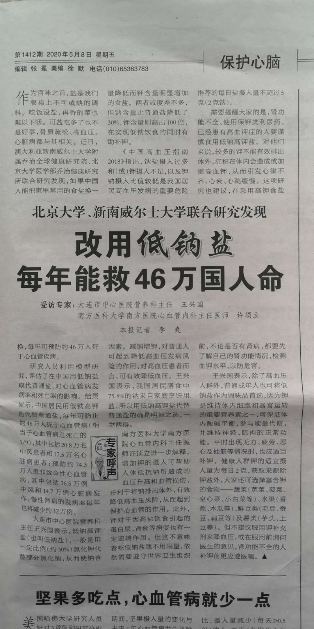 他說: 「雖然中國的鉀攝入量偏低,鈉的攝入量卻遠高于建議水平,主要來自家居、烹饪或餐桌上的鹽。