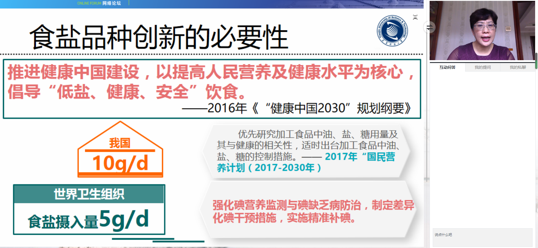 為準确把握後疫情時代鹽業面臨的形勢和存在的問題,推動行業健康、安全、高質量發展,2020年8月13日,中鹽協會以雲直播方式舉辦“新冠疫情後食鹽安全與健康消費”網絡論壇。論壇圍繞鹽業發展、食鹽安全、産品升級、健康消費等焦點,邀請國家市場監督管理總局食品生産安全監督管理司食鹽和食品添加劑監管處處長張士俠,湖北鹽業集團有限公司黨委書記、董事長劉江海,天津科技大學化工與材料學院院長唐娜和四川自貢馳宇鹽品有限公司董事長兼總經理鄒成華作主題發言。論壇由中鹽協會執行理事長王小青主持。