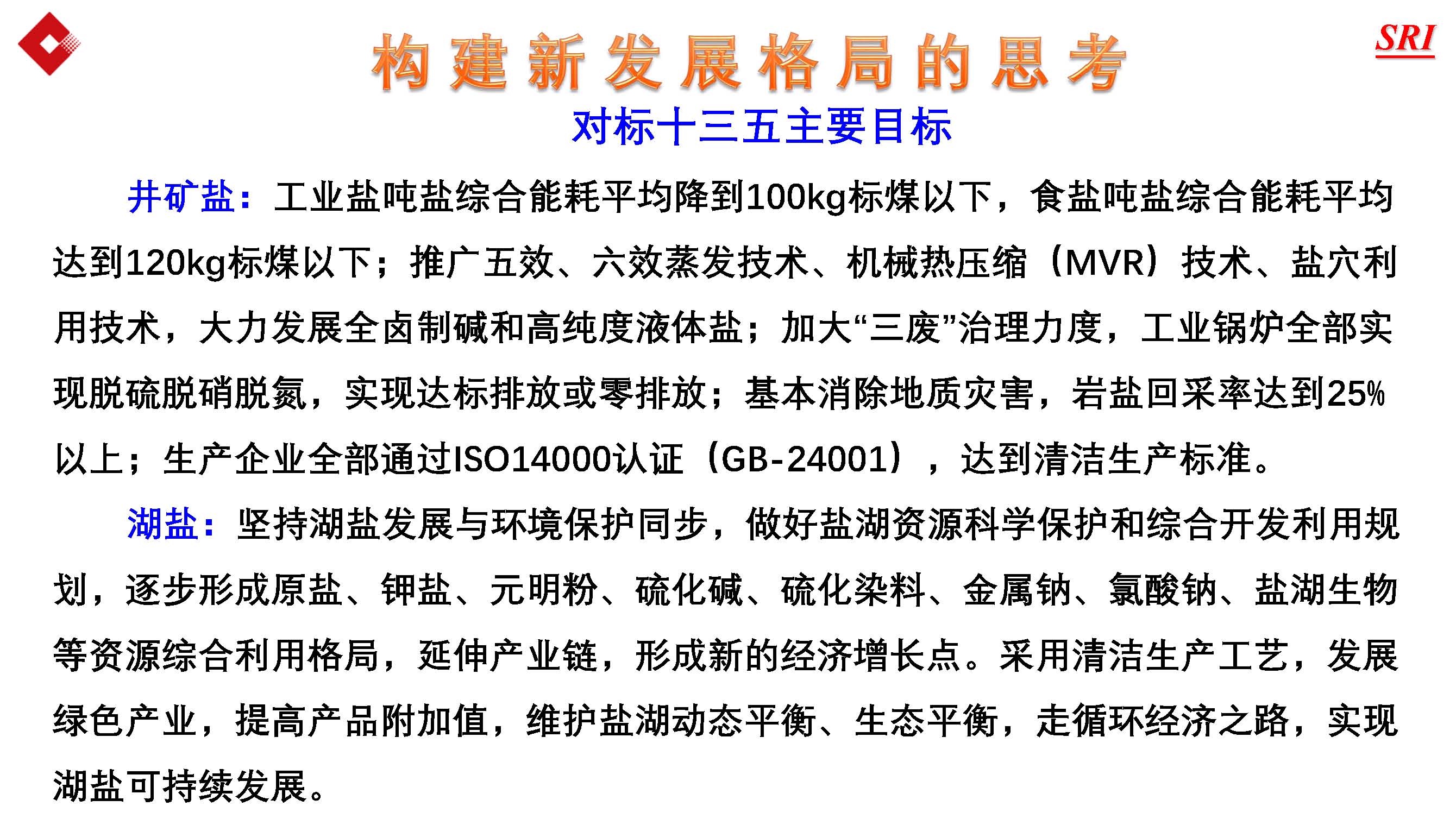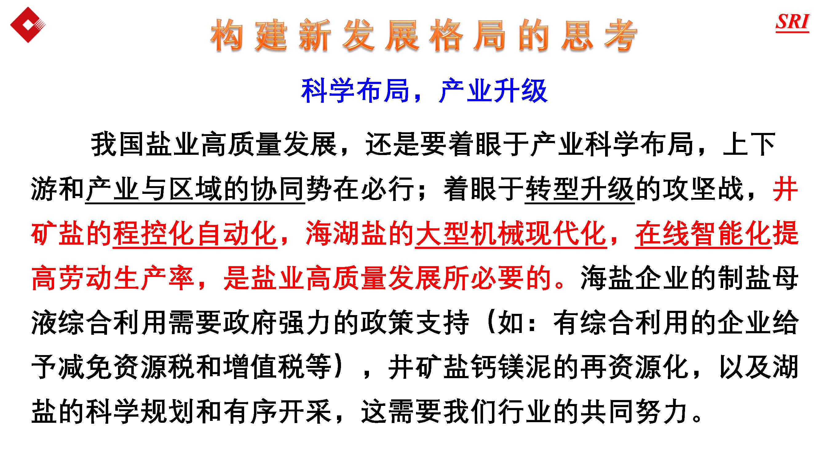 科學布局,産業升級。我國鹽業高質量發展,要着眼于産業科學布局,上下遊和産業與區域的協同勢在必行;着眼于轉型升級的攻堅戰,井礦鹽的程控化自動化,海湖鹽的大型機械現代化,在線智能化提高勞動生産率,是鹽業高質量發展所必要的。海鹽企業的制鹽母液綜合利用需要政府強有力的政策支持(如有綜合利用的企業給予減免資源稅和增值稅等),井礦鹽鈣鎂泥的再資源化以及湖鹽的科學規劃和有序開采,需要行業的共同努力。