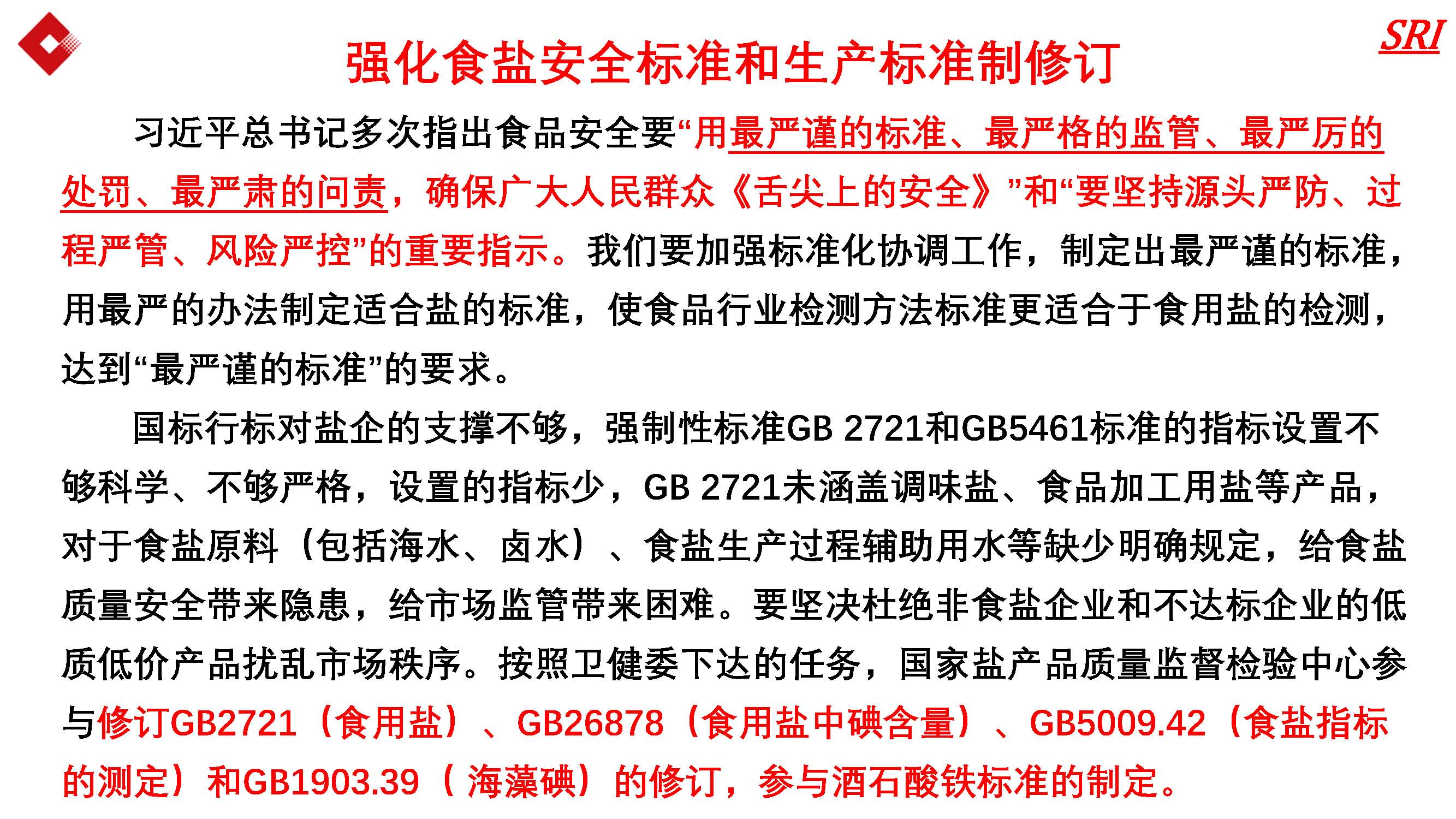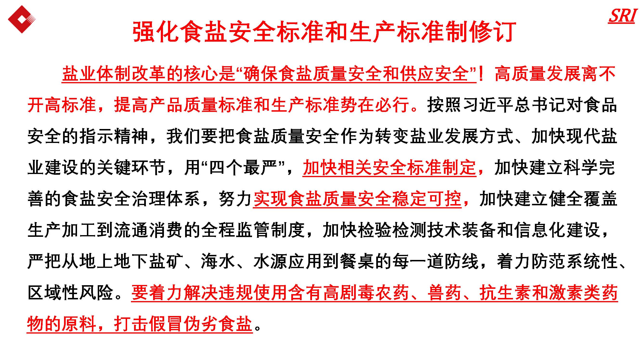 鹽業體制改革核心是“确保食鹽質量安全和供應安全”。高質量發展離不開高标準,提高産品質量标準和生産标準勢在必行。按照習近平總書記對食品安全的指示精神,我們要把食鹽質量安全作為轉變鹽業發展方式、加快現代鹽業建設的關鍵環節,用“四個最嚴”,加快相關安全标準制定,加快建立科學完善的食鹽安全治理體系,努力實現食鹽質量安全穩定可控,加快建立健全覆蓋生産加工到流通消費的全程監管制度,加快檢驗檢測技術裝備和信息化建設,嚴格把控從地上地下鹽礦、海水、水源應用到餐桌的每一道防線,着力防範系統性、區域性風險。緻力解決違規使用含有高劇毒農藥、獸藥、抗生素和激素類藥物的原料,打擊假冒僞劣食鹽。