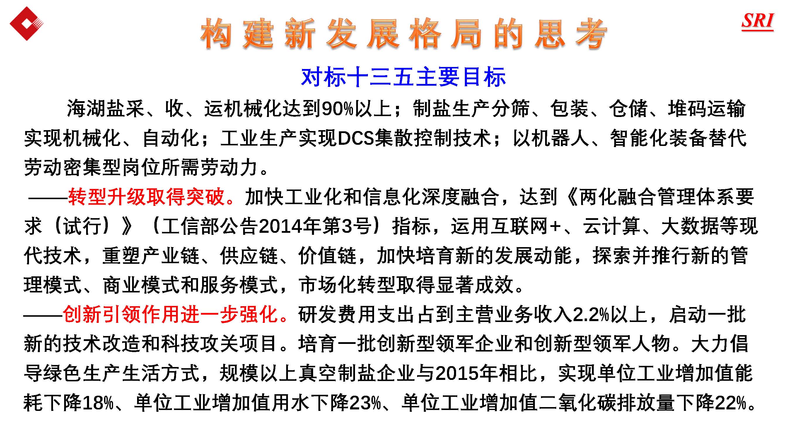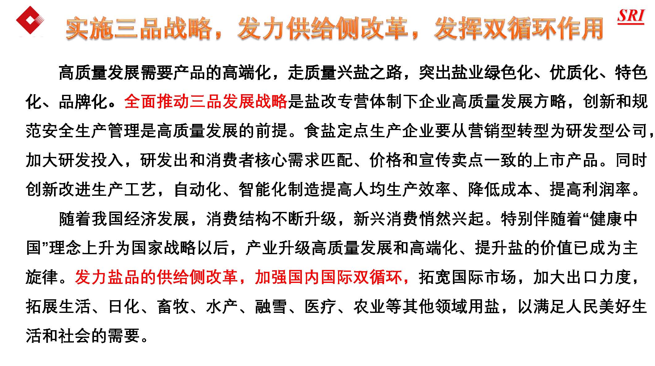 實施三品戰略,發力供給側改革,發揮雙循環作用。高質量發展需要産品的高端化,走質量興鹽之路,突出鹽業綠色化、優質化、特色化、品牌化。全面推動三品發展戰略是鹽改專營體制下企業高質量發展方略,創新和規範安全生産管理是高質量發展的前提。食鹽定點生産企業要從營銷型轉型為研發型公司,加大研發投入,研發出和消費者核心需求匹配、價格和宣傳賣點一緻的上市産品。同時創新改進生産工藝,自動化、智能化制造提高人均生産效率、降低成本、提高利潤率。