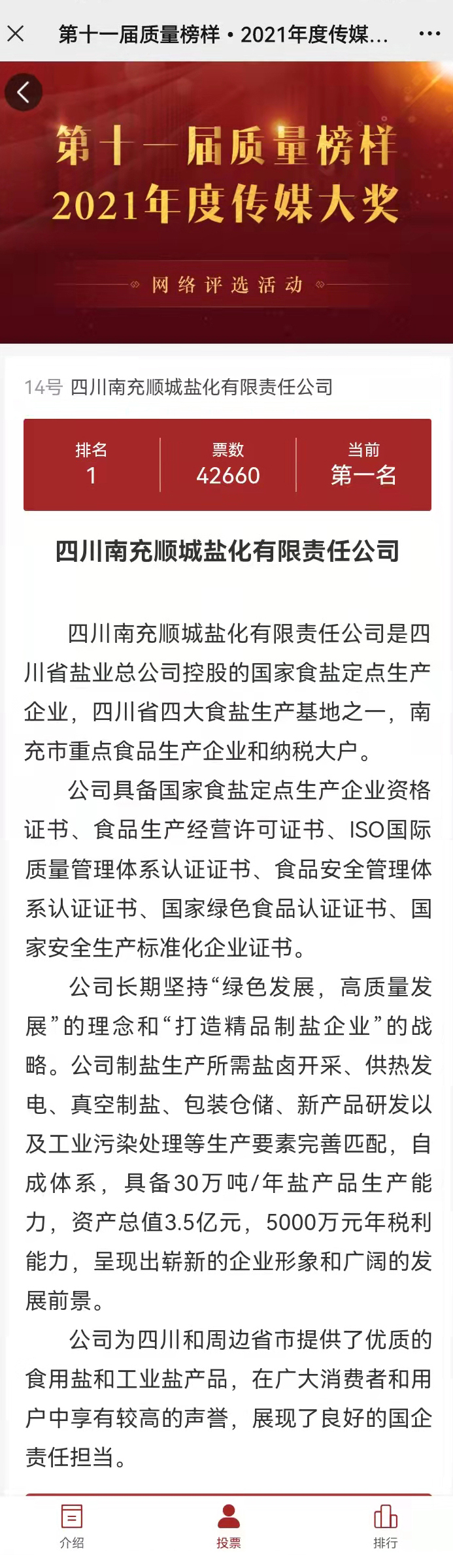 日前,由消費質量報社、消費質量網、成都深報地鐵傳媒、四川金熊貓地鐵文旅聯合主辦的第11屆質量榜樣·2021年度傳媒大獎順利揭榜,四川南充順城鹽化有限責任公司出品的“川晶”牌系列食鹽,上榜消費者喜愛品牌榜單。